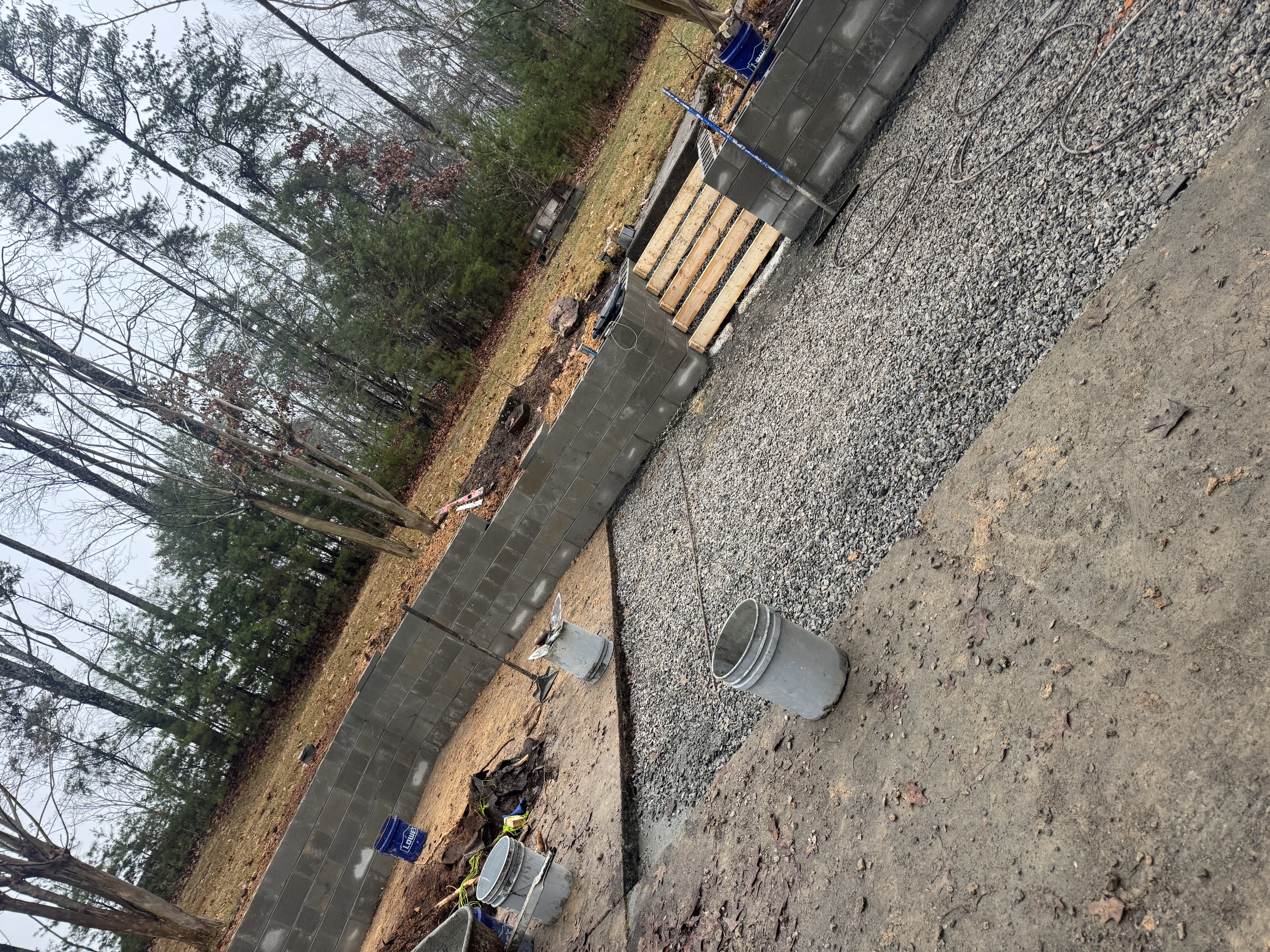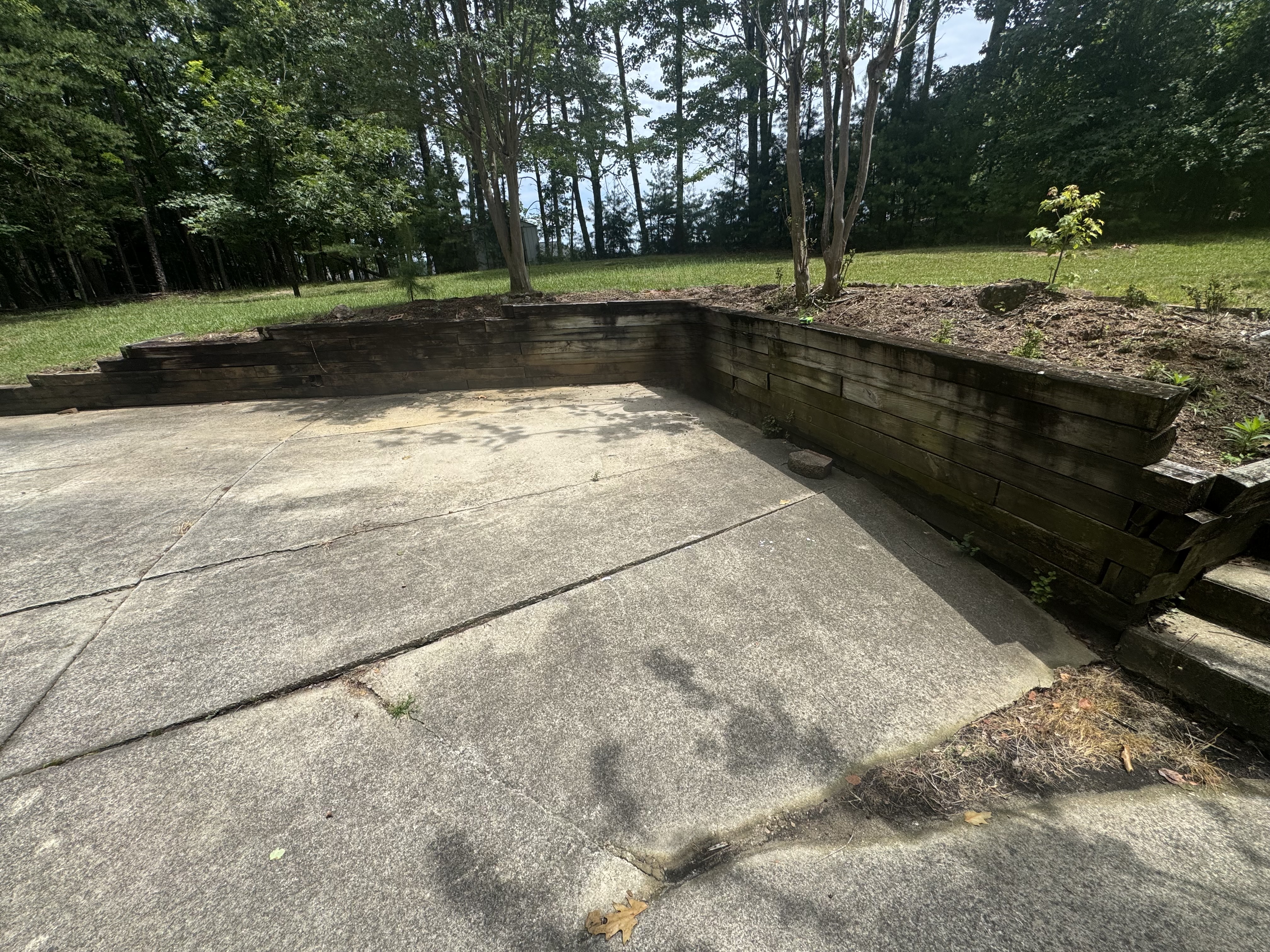 This project involved removing a damaged concrete pad that had begun to cave in due to failing timber retaining walls and poor drainage. We demolished the compromised concrete, installed a new cinder block retaining wall for long-term stability, and added a French drain system to properly manage water runoff. We then improved the base preparation, poured a new concrete pad, and built new concrete steps for safe access. The finished result created a stronger, more durable, and well-drained outdoor space.